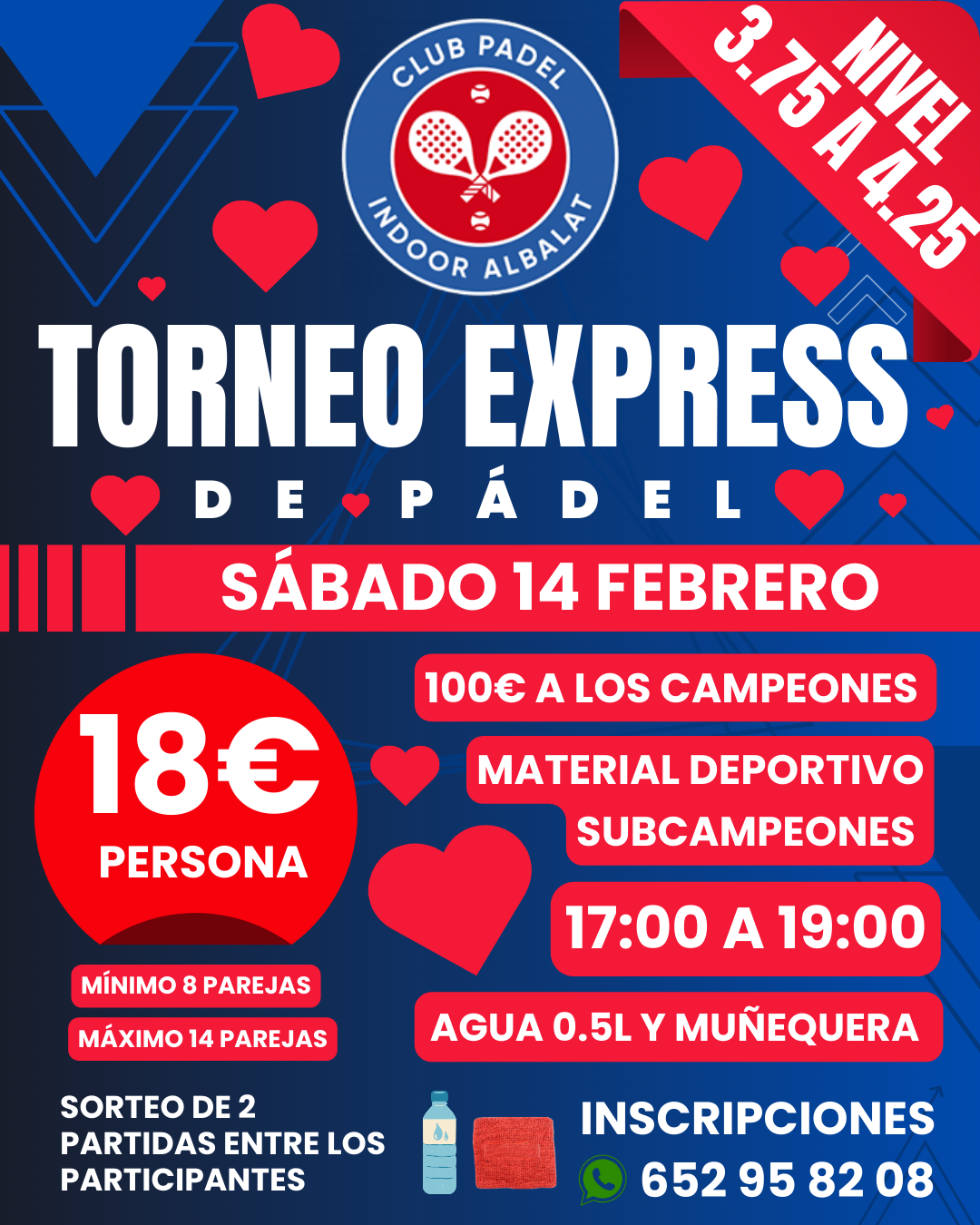 Torneo Express 3.75 - 4.25 10/02/2026 SÁBADO 14 TORNEO EXPRESS 3.75 A 4.25 DE 17:00 A 19:00 AGUA + MUÑEQUERA 100€ A LOS CAMPEONES MATERIAL DEPORTIVO A LOS SUBCAMPEONES INSCRIPCIONES: 18€/PERSONA MÍNIMO 8 PAREJAS WhatsApp o llamar al 652 95 82 08
