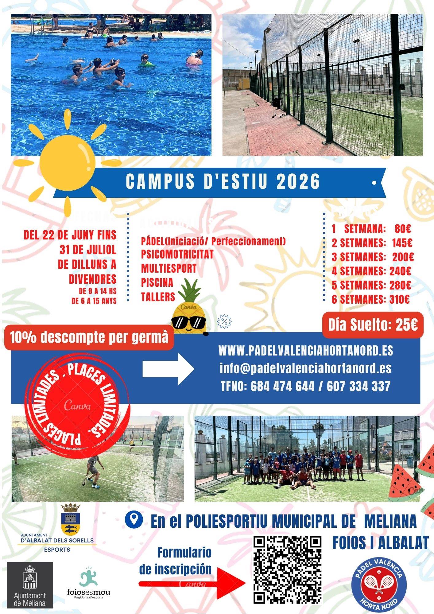 CAMPUS D´ESTIU 2026 MELIANA, FOIOS Y ALBALAT DELS SORELLS 22 DE JUNY A 31 DE JULIOL 28/04/2026 CAMPUS D´ESTIU MULTIACTIVITAT 2026 MELIANA, FOIOS Y ALBALAT DELS SORELLS FECHAS: Del 22 de Junio al 31 de Julio, ambos inclusive. 9:00 A 14:00