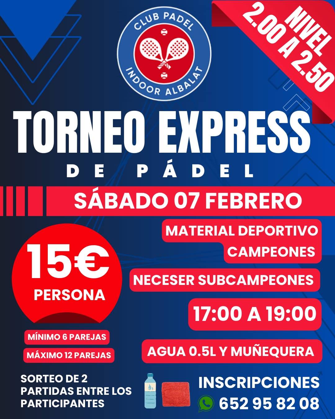 Torneo Express 2.00 - 2.50 02/02/2026 SÁBADO 07 FEBREO TORNEO 2.00 - 2.50 DE 17:00 A 19:00 AGUA + MUÑEQUERA MATERIAL DEPORTIVO A LOS CAMPEONES NECESER A LOS SUBCAMPEONES INSCRIPCIONES: 15€/PERSONA MÍNIMO 6 PAREJAS WhatsApp o llamar al 652 95 82 08